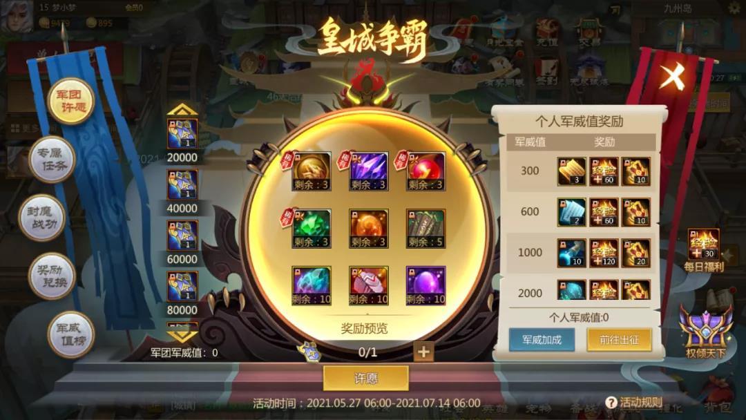 在这次皇城争霸活动中,军团许愿是大家最主要参与的板块了,这个板块一共也分为三个部分:个人军威值奖励、军团军威值奖励及军团许愿。