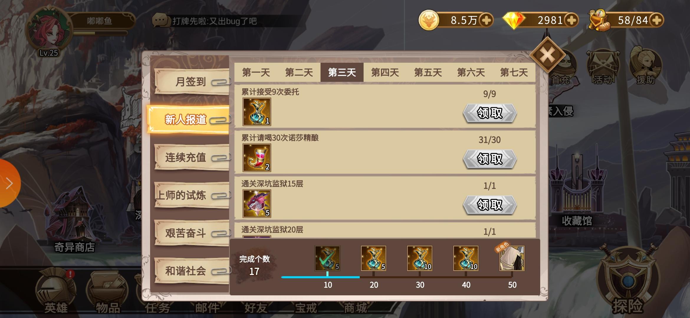 这是又出bug了?签到三天了新人奖励领不了