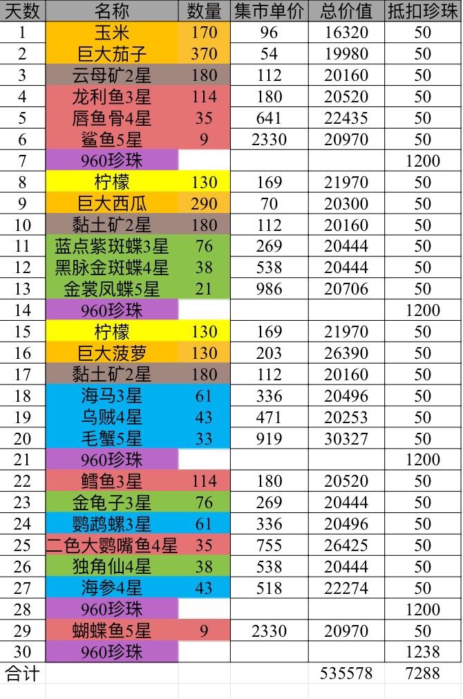 集市这边都是当天的买入价格,这一套算下来,花费了我4800珍珠+53w5k多的金币。