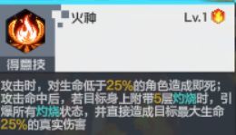 得意技:攻击时,对生命低于25%的角色造成即死,攻击命中后,若目标身上附带五层灼烧时,引爆所有灼烧状态,并直接造成目标最大生命25%的真实伤害