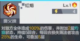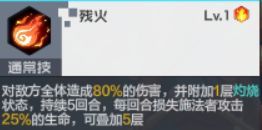 奥义技:对敌方全体造成100%伤害,并附加两层灼烧状态,持续五回合,每回合损失施法者攻击25%的生命,可叠加五层
