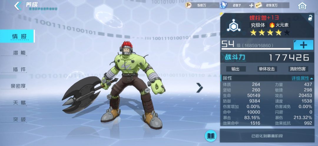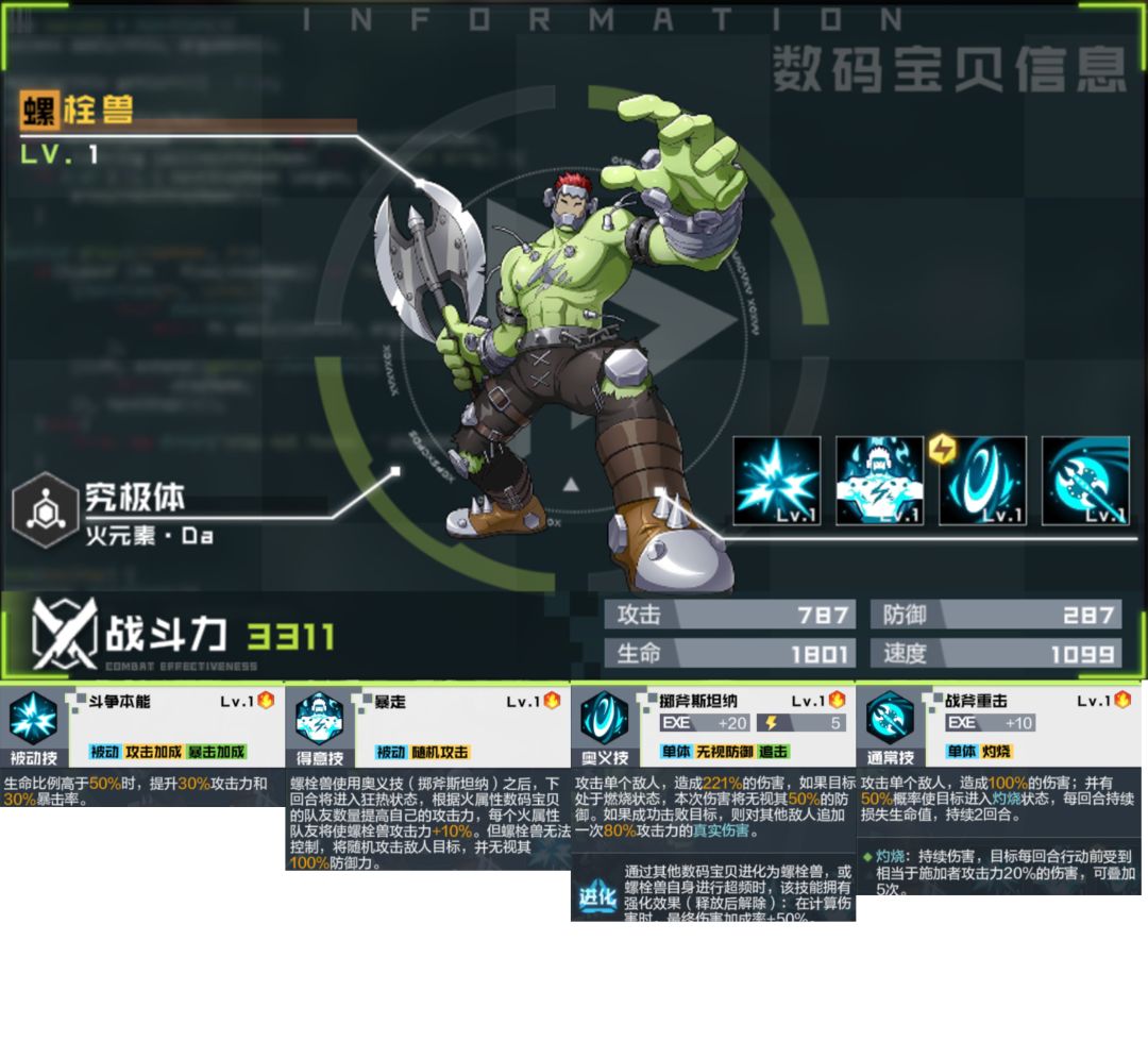 奥义技:单伤,如果目标处于灼烧状态 ,无视其50%防御,如果击败目标,对其他敌人追加一次80%攻击力的真实伤害。得义技:释放奥义技后下回合根据火属性数码兽队友数量提升自己的攻击力,每个火属性队友增加10%,但无法控制,随机攻击目标,无视其100%防御力。通常技:单伤50%概率使目标进入灼烧状态,持续两回合。被动技:生命高于50%时,提升30%攻击力和暴击率