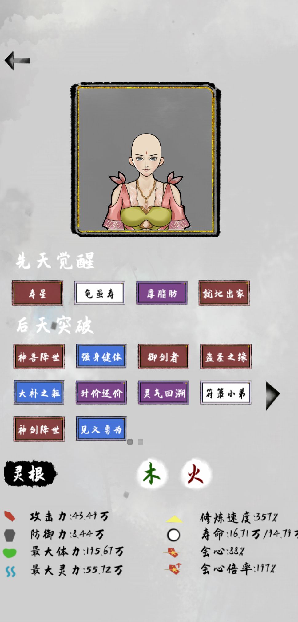 毕业了,游戏里寿命和钱很重要,元婴前随便玩玩,元婴后就靠钱来升级了,法宝金箍棒就很好,也容易获得,天赋可以选个寿星加一下基础生命,基础生命很重要,寿命不够可以攒一下寿命丹,舍利子刷不到也没啥