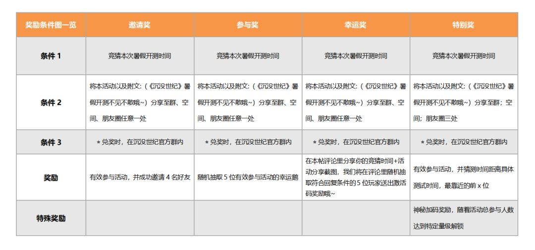 -特别奖:猜测时间距离沉没世纪官方公布的具体测试时间,最靠近的前x位赏金猎人们不仅将获得宝贵的“测试资格激活码奖励”, 此外,更有惊喜的“神秘加码奖励”等着大家!