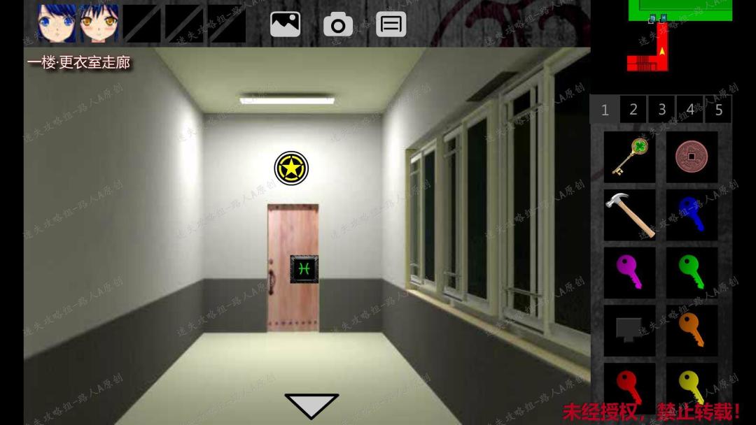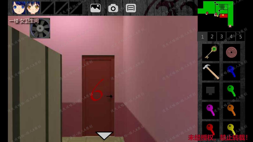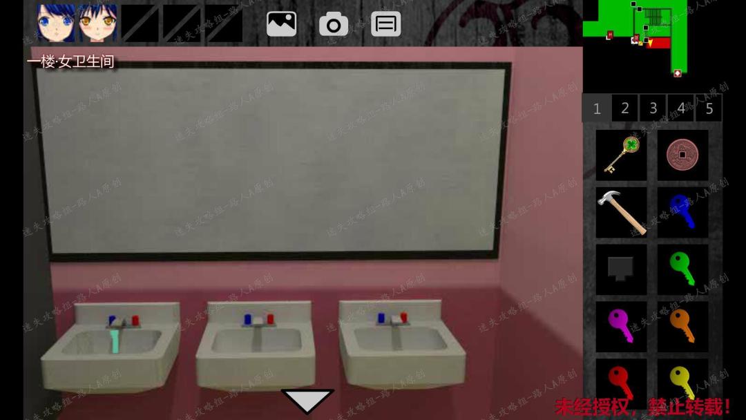 23. 前往一楼东侧廊,用对应的【小钥匙】打开红色的门,进入一楼女卫生间。点击墙上的字符等式,素素会有提示。23.1、23.2