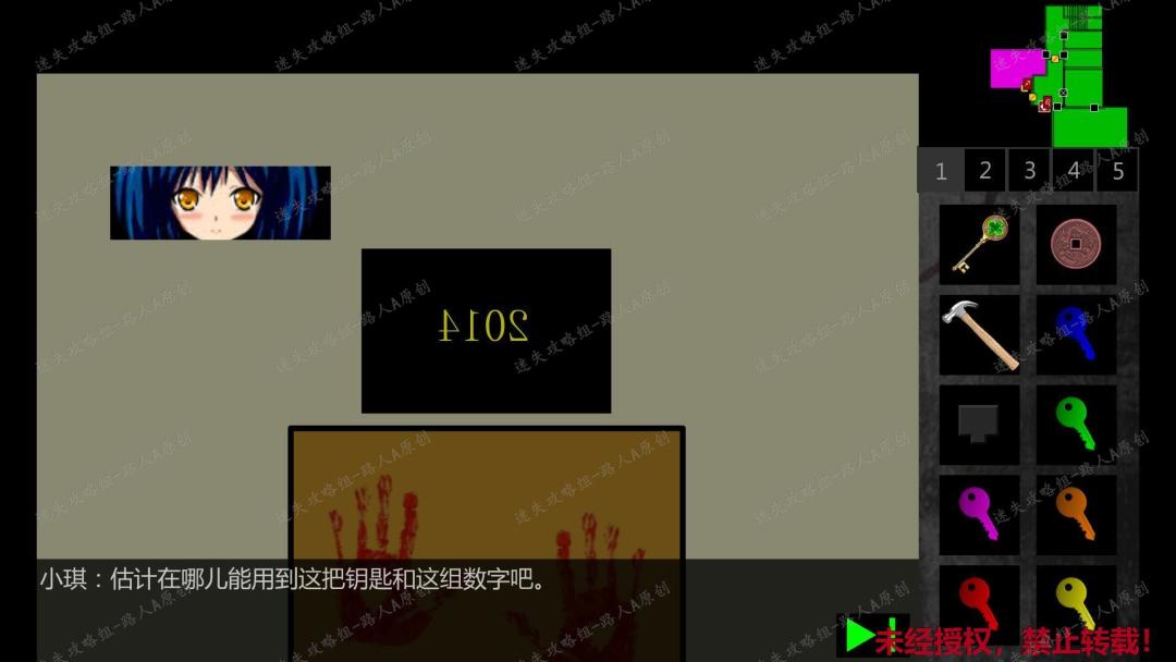 28. 剧情过后,再次进入二楼空置教室,把【拼图】放入血手印凹槽,得到【木之钥】和密码:2014。28.1