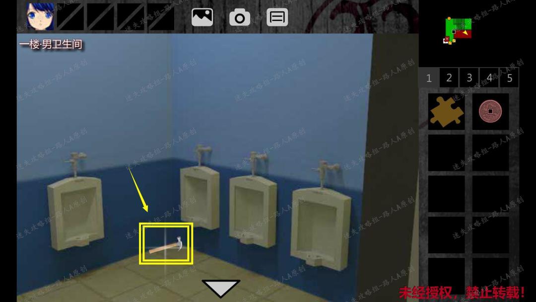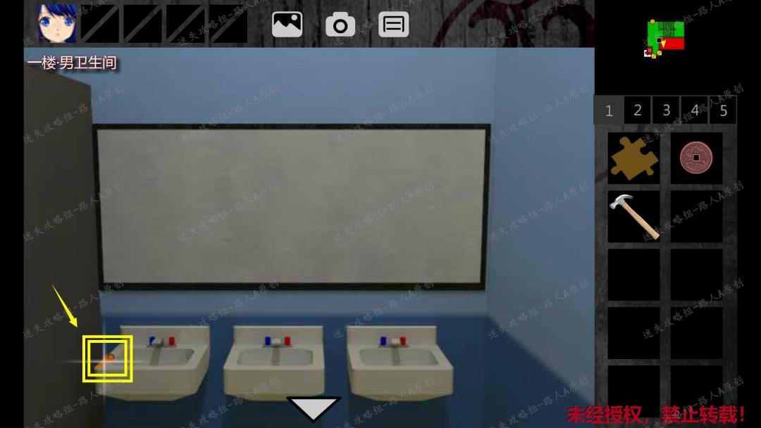 16. 离开女卫生间,移动到一楼东侧廊,进入一楼男卫生间。捡起【锤子】和【橙色小钥匙】。(点击门左侧的墙壁可以找到洗手池)16.1、16.2