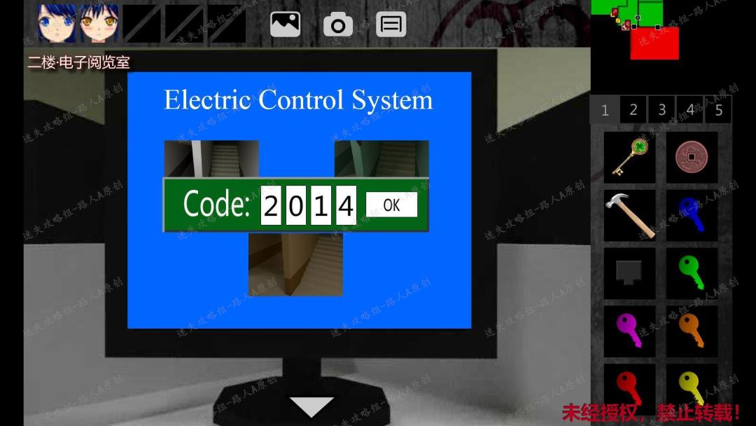 29. 前往二楼电子阅览室,点击电网控制系统的电脑,点击右上的楼梯图像,输入密码:2014。解除二楼东侧廊楼梯的电网。29.1