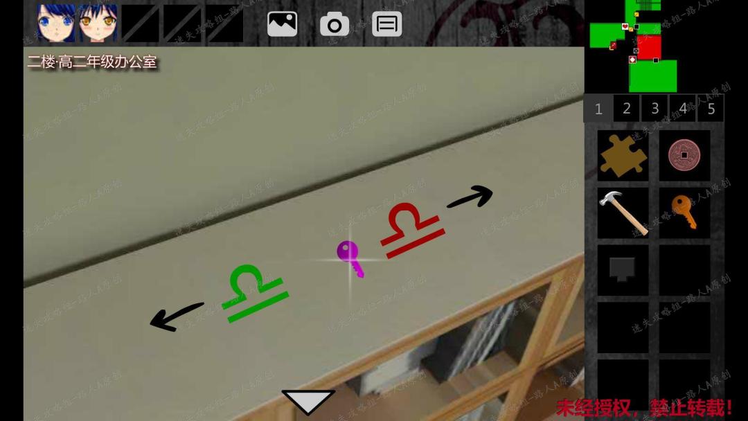 14. 在二楼空置教室,捡起【红色小眼球】,把【红色小眼球】放入墙上的黑白人脸,获得【拼图】和【铜币】。14.1、14.2