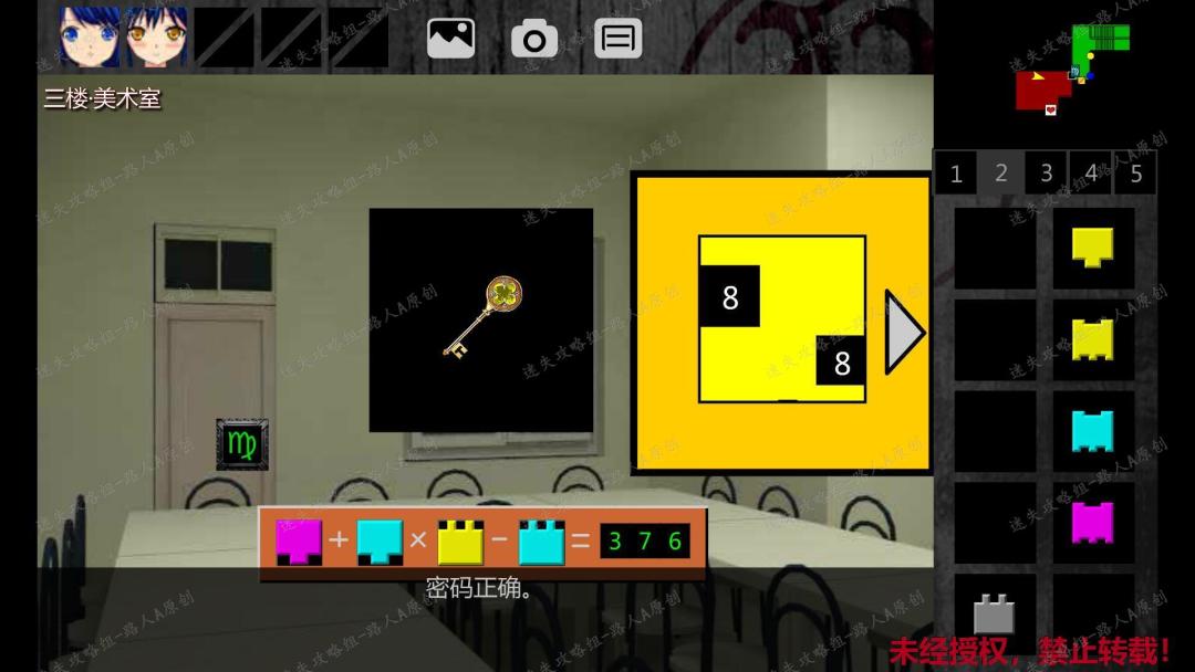 32. 点击墙上的算术谜题,上面方框内的数字为随机,下面计算等式的4个方框可以放入方块。以下图为例,方框数字为8,下面放入的方块凹槽数从左到右分别为:2、2、3、3。则计算等式为:(2x8)+(2x8)x(3x8)-(3x8)= 376。376就是要输入的密码,解开谜题后,获得【金之钥】。32.1