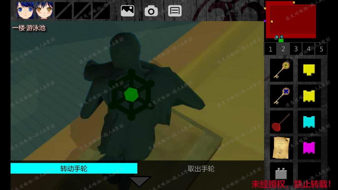 39. 前往一楼游泳池。点击游泳池边上的雕像,取下【红色手轮】,放上【绿色手轮】,选择【转动手轮】,排掉游泳池的水。39.1