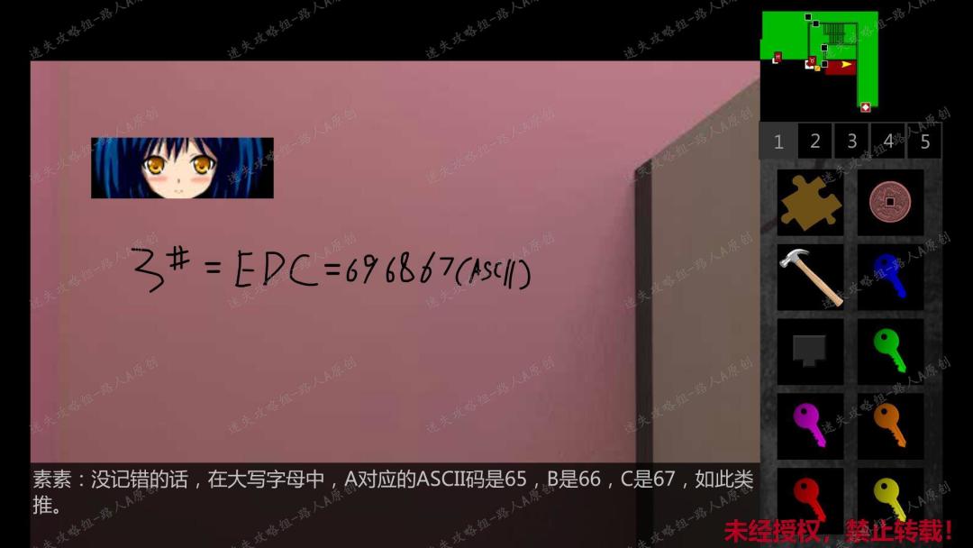 25. 前往二楼高二年级办公室,从办公室里的门进入二楼电子阅览室。在电子阅览室的另一扇门,门边上有个密码锁,放入【磁卡】,输入磁卡背面符号对应的字母ASCII编码。(磁卡背面符号是随机的,对应的字母ASCII编码请参考上面的攻略步骤)25.1