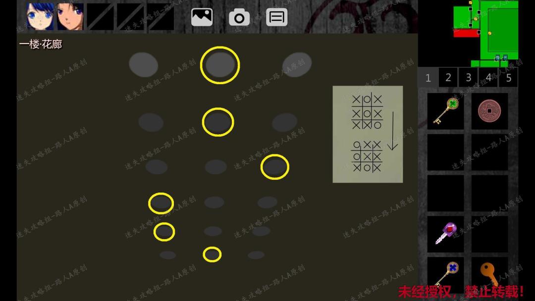 152.前往一楼游泳池,用【月之钥】打开门,进入一楼花廊,触发剧情。153.根据三楼语音室的井字棋提示(随机),O表示正确的路线,从上往下依次点击。获得【土之钥】。(如果点错位置,就会达成坠落结局)153.1、153.2