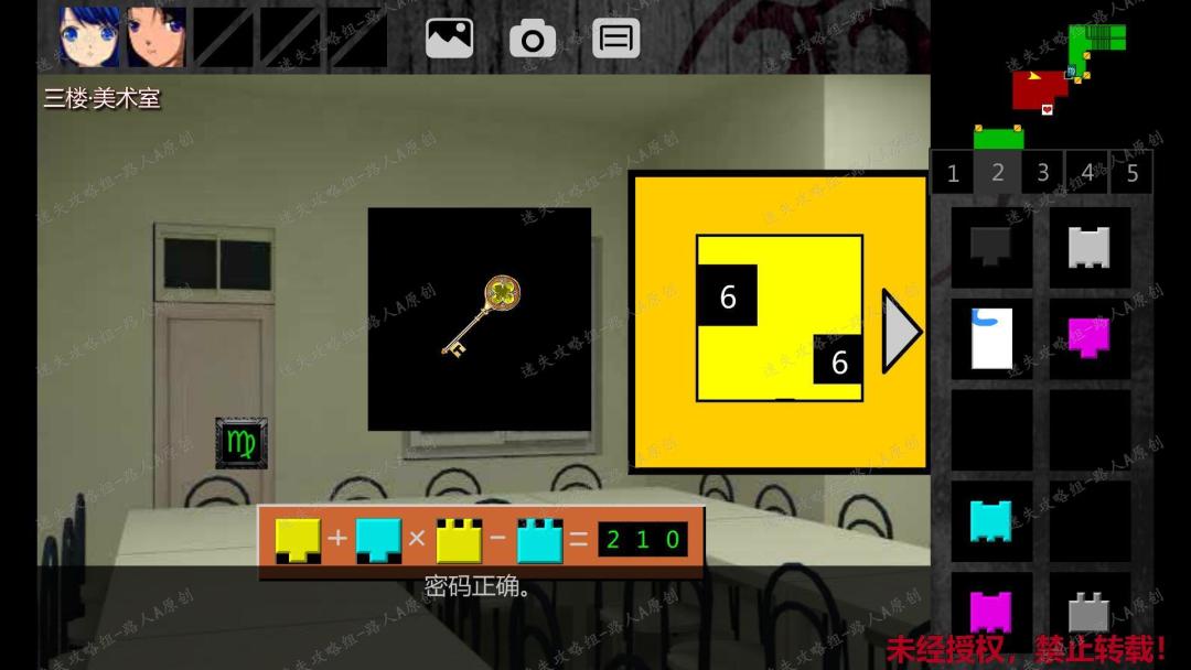 138.点击墙上的算术谜题,上面方框内的数字为随机,下面计算等式的4个方框可以放入方块。以下图为例,方框数字为6,下面放入的方块凹槽数从左到右分别为:2、2、3、3。则计算等式为:(2x6)+(2x6)x(3x6)-(3x6)= 210。210就是要输入的密码,解开谜题后,获得【金之钥】,取回算术谜题里的所有方块。138.1
