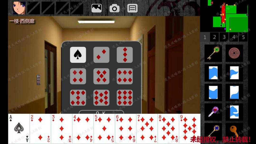 144.点击门边上的扑克牌谜题,仔细观察这些扑克牌图案,会发现其中一些图案是错的。而在这9张牌中,有1张是亮起的。如果亮起的扑克牌图案是正确(错误)的,则点亮其他图案正确(错误)的扑克牌。以下图为例,亮起的扑克牌是黑桃A,图案是正确的,所以要点亮其他图案正确的扑克牌:方块3、方块4、方块5、方块8。144.1