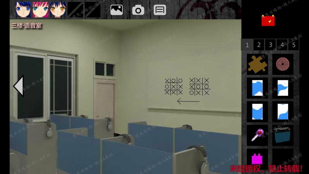 125.解决谜题后,点击墙壁上面的天花板洞口,进入三楼语音室。捡起【品红色方块】,记录墙上的井字棋提示。125.1