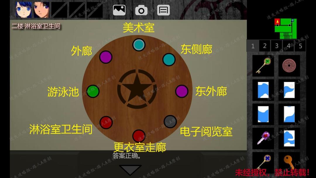 150.完成谜题后,进入圆盘的洞口,来到二楼平台,触发剧情,获得【地下室地图】。然后捡起圆盘上的【绿色手轮】。151.前往一楼女更衣室,把6块【瓷砖】放入墙上的画框(位置要正确,如图),获得【马桶吸】。151.1