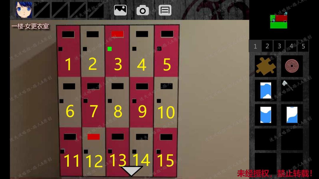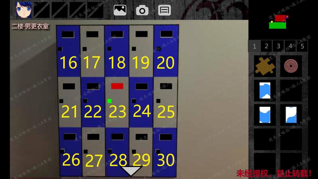 >>✅迷失攻略组目前已经制作了大量的游戏图文攻略,比较难的小游戏还录有视频哦~有需要的话,欢迎大家前往:迷失攻略组 公众号看看丫✅<116.男淋浴室也有和女淋浴室一样的点亮蝴蝶的谜题,在淋浴隔间里捡起【瓷砖】,打开男更衣室闪红灯的柜子,获得【密码箱】。(仔细观察会发现:男更衣室的绿灯柜子编号 = 女淋浴室点亮的蝴蝶数量 + 男淋浴室点亮的蝴蝶数量,而男更衣室第一个柜子对应的蝴蝶总数是16,所以男更衣室的柜子编号应该是16到30)116.1