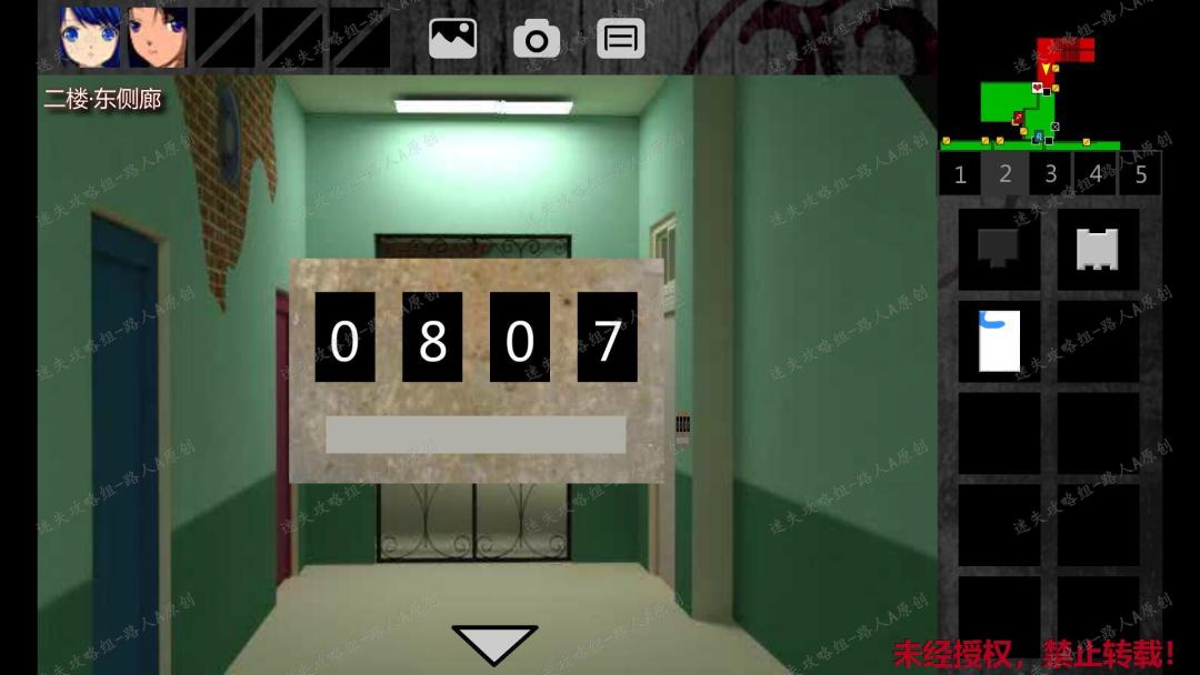 132.返回一楼体育器材室,点击台球桌,捡起【瓷砖】。133.前往二楼东侧廊,点击白门旁边的密码锁,输入密码:0807。进入二楼空置教室。133.1
