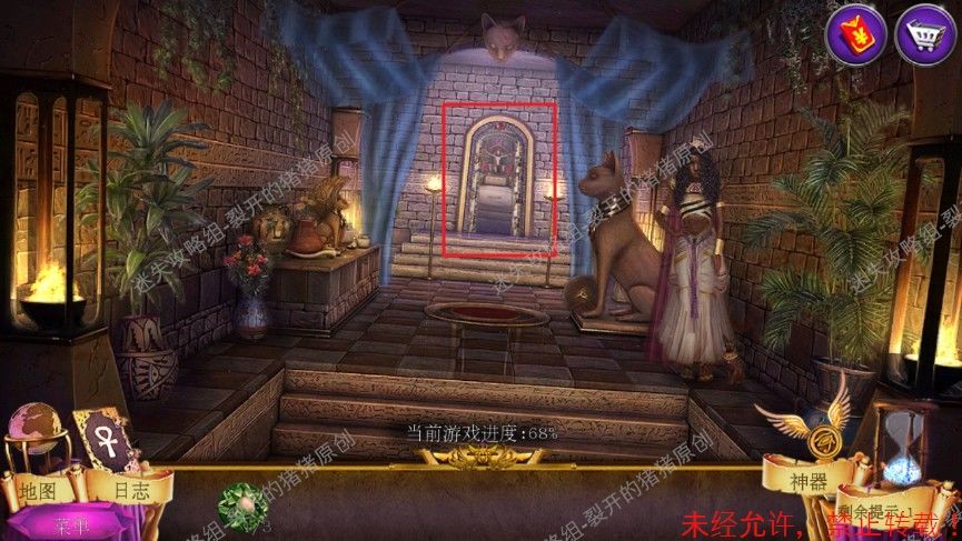 🍄第七章🍄61.进入到阿努比斯神的房间,天秤用钳子重新调整,秤盘中摆上羽毛,过的爱希丝钥匙,重返猫神的房间把钥匙插入尽头的房间,完成游戏(线组成上半部分)后进入卧室。61-1.2