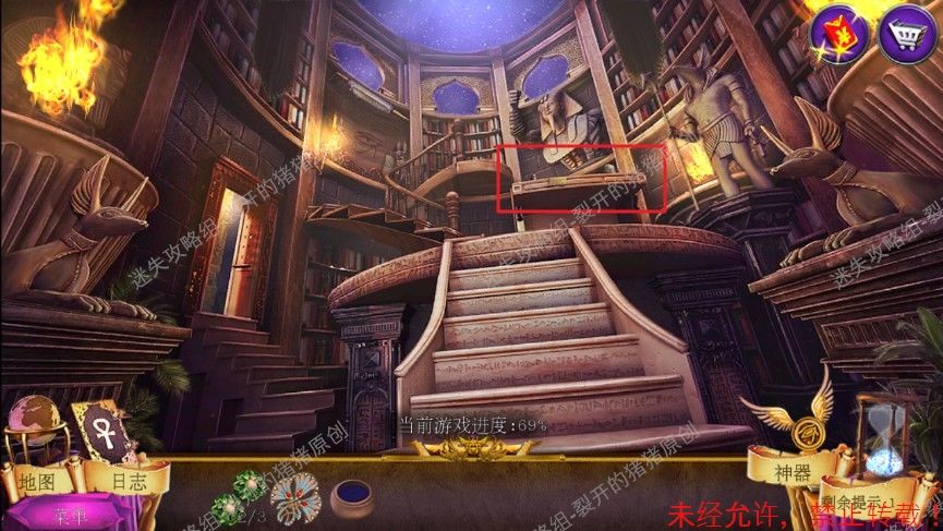 65.再次返回到猫神的卧室,抽屉的把手置入场景靠左柜子上的石雕的下方,拿到翅膀1和宝石3,放入三块宝石,又一次进入寻物游戏完成寻物游戏后获得拼图碎块。65-1.2