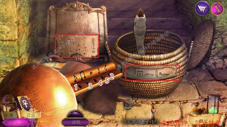 🍄第二章🍄11.观看剧情之后,我们穿越回了古埃及的集市,首先和右边的商贩对话,我们在水果摊上面拿到了一卷纸草,在左边石头雕像下方拿到了金币和玻璃,用玻璃利用太阳把纸草点燃,用燃烧的纸把在地上水果上面的马蜂赶走,进入寻物游戏完成后拿到金币(盒子打开用黑色)拿到了金币。11-1.2.3