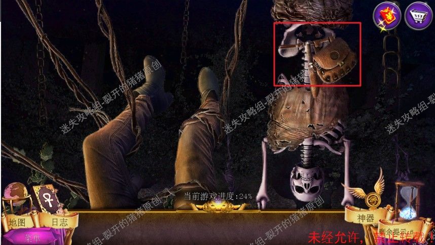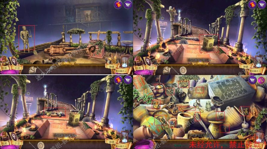34.紧接着,在船上的雕像的胸口处放入我们之前获得的船桨,拿到了箱子的零件,返回到桥上把箱子嵌入物放入箱子,刀片停下,过桥,点击杂物堆完成寻物游戏拿到尖碎块。34-1.2.3.4