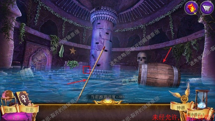 33.石像后面的门打开,进入来到一艘船边,点击手套神器把鬼魂消灭,把地上倒下的雕像挪走,然后拿到了钥匙和权杖,使用权杖挪开雕像,在底下拿到船桨嵌入物。33.1-2