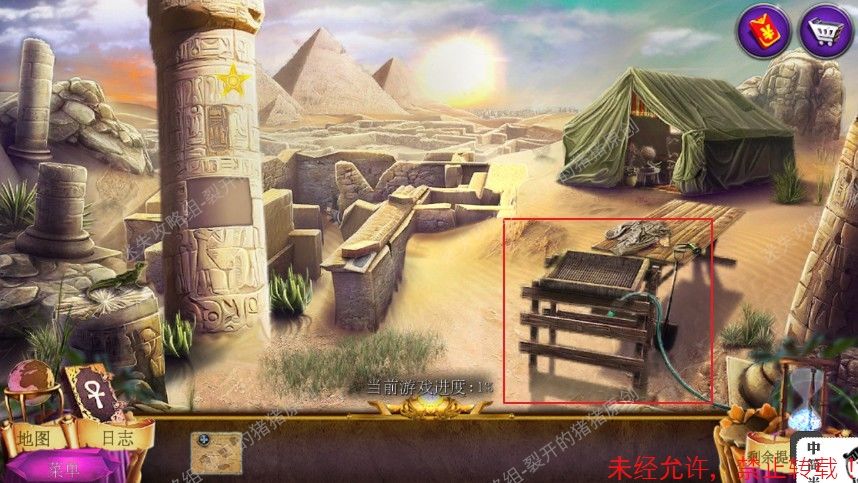 3.用两把铲子把中间的小石头堆铲走,再用刷子刷挖出的石碑,我们拿到石碑之后,点击大场景右下角木桌,把筛网放在框子里,再把木桶放上,在桌子上拿到一个软管喷嘴和右边的水管结合,把杂志冲洗干净,拿到碎片,完成石碑上的拼图(点击碎片就可以旋转)。3-1.2