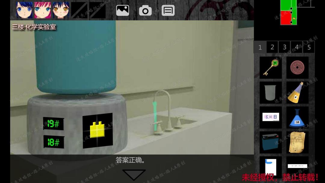 235.用【黑桃钥匙】打开门,进入三楼西侧廊。236.返回三楼化学实验室,查看黑板上的试剂混合提示,结合珍弓的说明,可以得知: