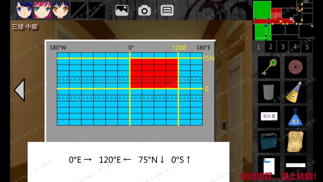 239.返回三楼中廊,点击白色门边上的经纬网谜题,根据珍弓的提示,在经纬网里标出纸条上的经纬线(纸条的经纬线是随机)。以下图为例,先标出4条经纬线,这4条线相交,会在中央形成一个闭合区域,点红这个区域的所有格子,答案正确,门锁解除。239.1