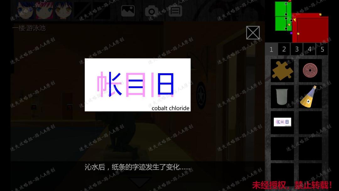 213.捡起课桌上的【纸条】,在物品栏里查看【纸条】,右下写着cobalt chloride(二氯化钴),珍弓提示这是受潮后会变色的物质。214.返回一楼游泳池,把【纸条】放入水里,显示K = n(n是随机数字,比如下图是K = 8)214.1