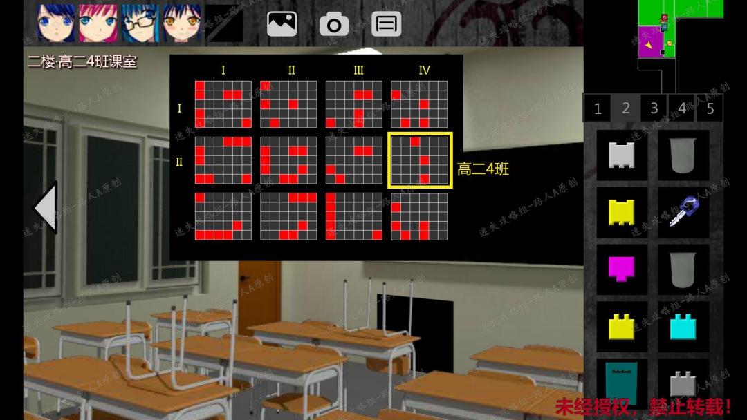 247.前往二楼高二4班课室。点击电视,纵向罗马数字代表年级,横向罗马数字代表班级。佩芝提示这些方格暗示课室的桌椅,而通过观察,可以发现红色方格对应的是椅子倒置的课桌。可以调查的课室一共有8间(高一1、2、3、4班以及高二1、2、3、4班),而电视上有12组图案(其中4个是多余的干扰项),只要把8组图案调到正确位置即可。(因为视角问题,课室里只能看见一部分的椅子倒置课桌,但是通过对比,仍然可以找出对应课室的电视图案)247.1、247.2