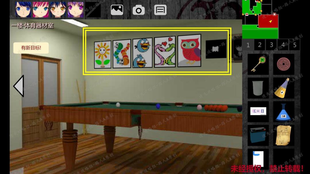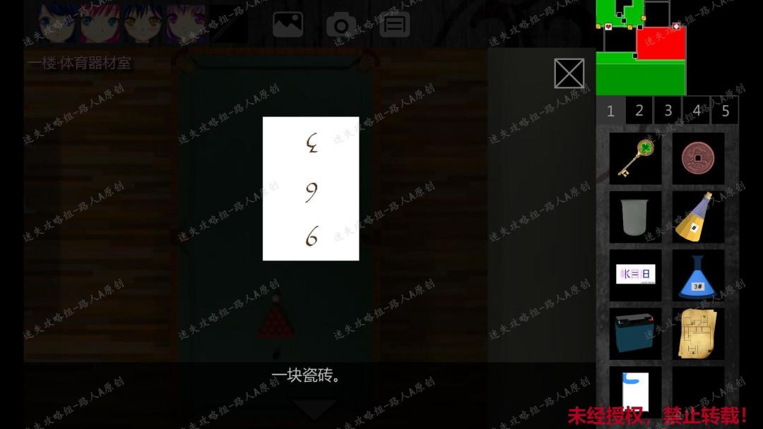 224.用【木之钥】打开门,进入一楼东侧廊拐角。打开反锁的门,进入一楼体育器材室,触发剧情,选择【毫无头绪】,获得【教学楼地图】。225.剧情过后,返回一楼体育器材室。点击台球桌,捡起【瓷砖】。在物品栏里查看【瓷砖】背面,得到密码:963。225.1