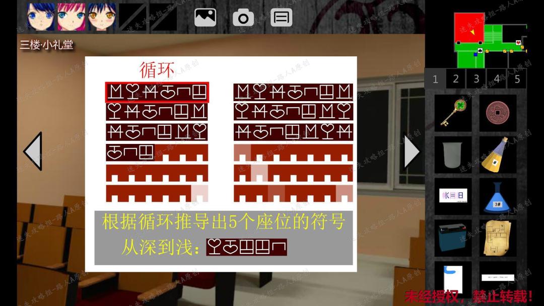 233.返回三楼小礼堂,查看门边上的座位表,发现5个座位变了,而查看这些座位是空的,没有符号,珍弓提示可以通过有符号的座位来推导。以下图为例,把有符号的座位全部标记出来,发现符号是循环的(从左往右一直循环),可以根据循环推导出5个座位的符号,按照座位从深到浅排列这5个符号,就是正确答案。(注意,符号和循环的符号数量都是随机的,可能是3个符号为一组循环,也可能是4个符号为一组循环,请根据自己的具体情况推导。)233.1
