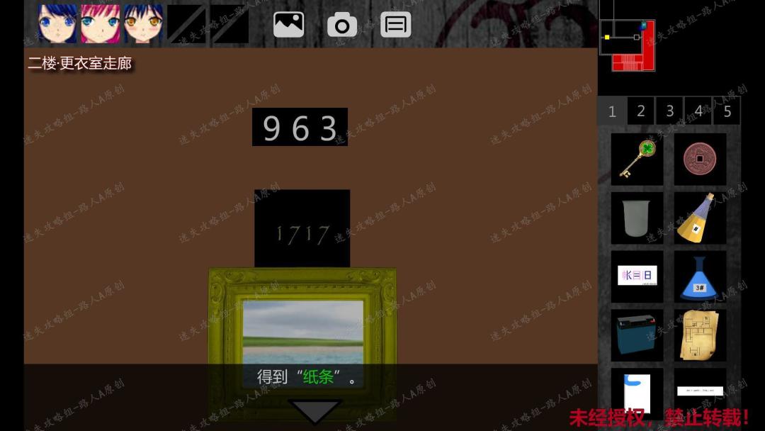227.前往一楼游泳池,靠近游泳池的双鱼座符号的门,把【白色方块】放入门边的凹槽,解锁门,取回【白色方块】,进入一楼更衣室走廊。228.剧情过后,上楼梯,进入二楼更衣室走廊,墙上的密码输入:963。点击挂画,获得【纸条】以及密码:1717。228.1