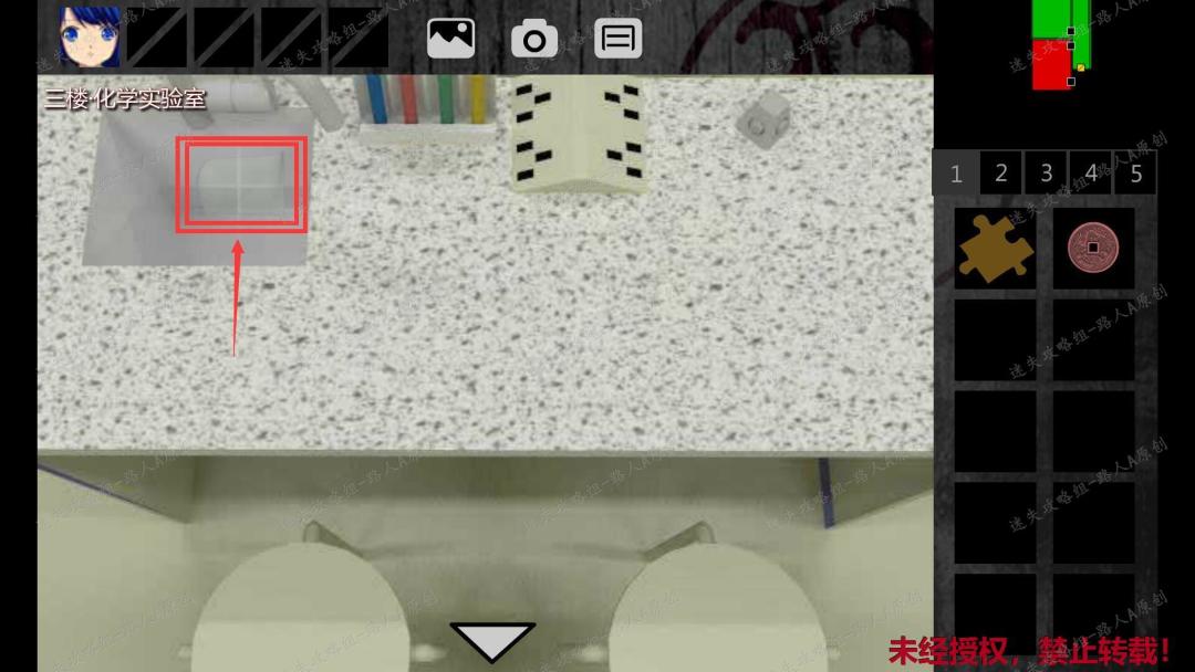 206.把【拼图】放入黑白人脸右边墙上的拼图凹槽(一个血手印),小琪被传送到三楼物理实验室。
