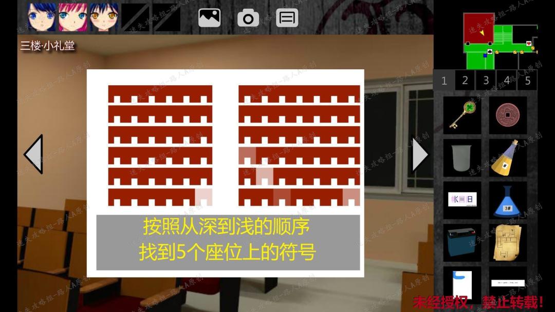 232.点击门边上的座位表,发现其中有5个座位的颜色较浅,按照从深到浅的顺序找到这5个座位上的符号(符号随机),然后返回三楼中廊,把5个符号输入墙上的谜题,获得【黑桃钥匙】。232.1、232.2