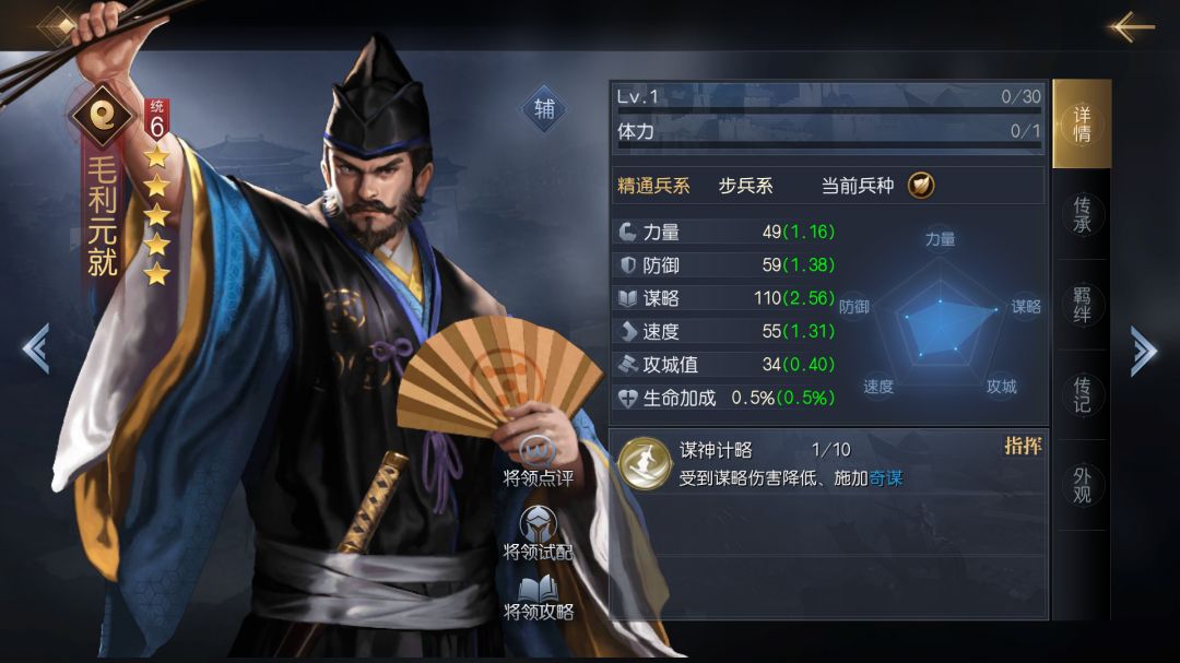 第三名将领选择空间最大,即可搭配医师类将领,也可搭配辅助类将领,考虑菜刀队中主将拥有高额会心率,所以这里选择的是每回合有几率为诸葛亮提供70%奇谋状态的毛利元就。为其搭配上忠诚护卫+尼罗河馈赠,即可再次提升诸葛亮35%输出加成。
