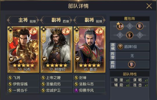 如图中的菜刀队,吕布属于核心将领,技能中一骑当千、忠诚护卫属于核心技能,阿提拉与嬴政均有替换将领,所以我们拥有这三个核心因素即可自行补足菜刀队。另外两名副将选择队伍先手、物伤增强、伤害补充的即可。