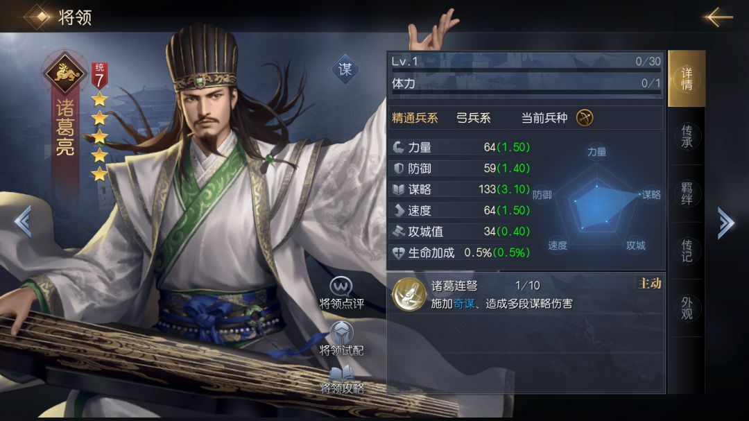 首先选定核心主将,诸葛亮、拿破仑都是爆发能力非常出色的将领,考虑主动技能的发动次数优化比追击困难,所以将重点放在技能释放的优化上,为其搭配智计百出+治世,提供稳定输出与45%的伤害加成。