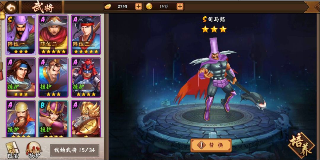 介绍完武将获得途径,现在谈谈武将系统。乍一看武将系统有点复杂且听我一一道来。点开武将培养可以清晰的看到左边是武将属性、培养和简介。右边则是相对应的概述、技能、升星、突破和觉醒。在这个界面中,玩家可以对武将进行详细而全面的了解。