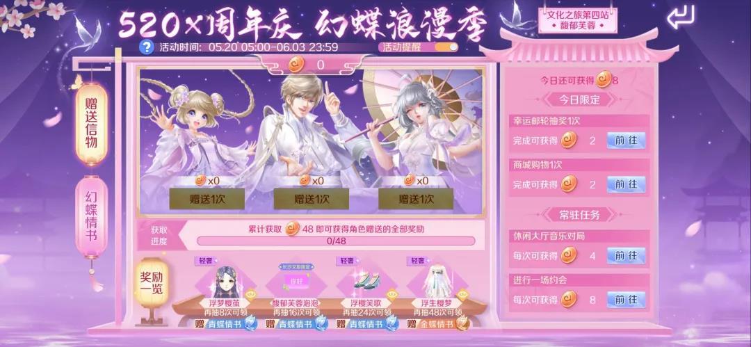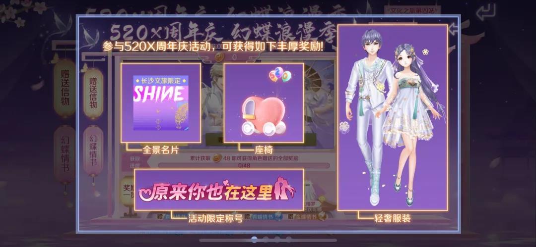 除此之外,向玩家寄出情书,都将获得【幻蝶值】!如果寄出金蝶情书,还将附赠1封【闪耀邀请函】(可用于闪耀新舞台进行抽奖)~