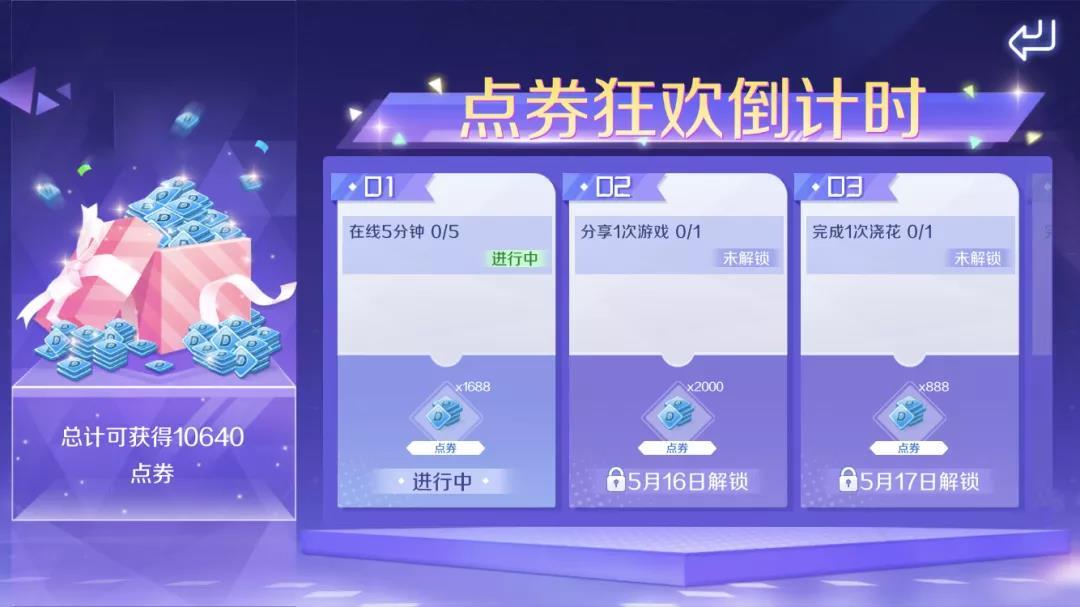 最后三天!截止至5月23日,在线5分钟即可领取1688点券,分享1次游戏即可获取2000点券!点券狂撒ing,朝着商城免券购冲鸭——