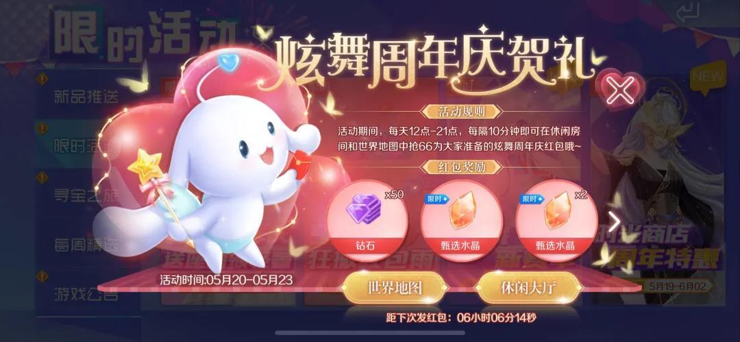 5月20日-5月23日期间,每天12点-1点、20点-21点两个时间段内,每隔10分钟即可在休闲房间和世界地图中抢炫舞周年庆红包,一天共计可抢12次!
