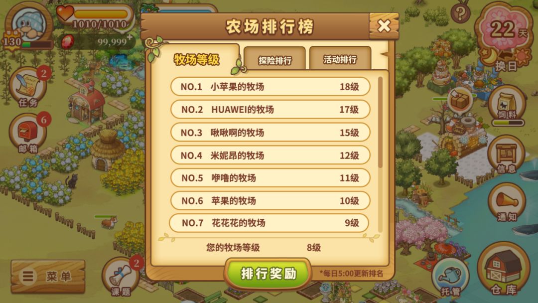 分别按照牧场等级,探险岛屿个数,特定活动要求进行排行