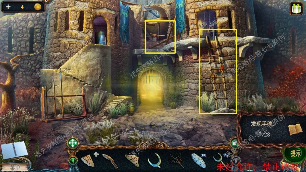 34、进入屋子,拿到桌子上的瓶子和制作药水的配方(黄色),再拿到楼梯边上的手稿【6】和老鼠(红色)。34