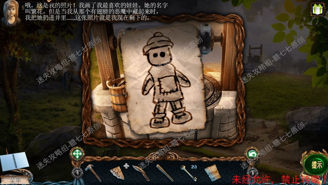 12、然后在水井上拿到木槌【3】,半条钳子和洋娃娃照片。12