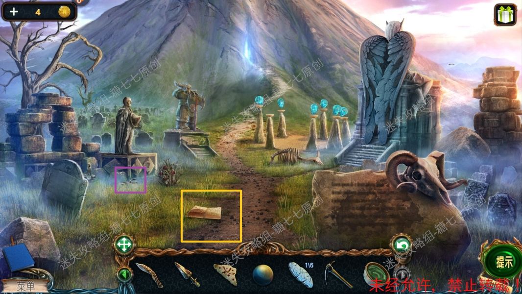23、马离开,走过小路。24、拿到手稿【4】(黄色),炮弹(红色),羽毛化石【1】(绿色),断镐斧(紫色)。24