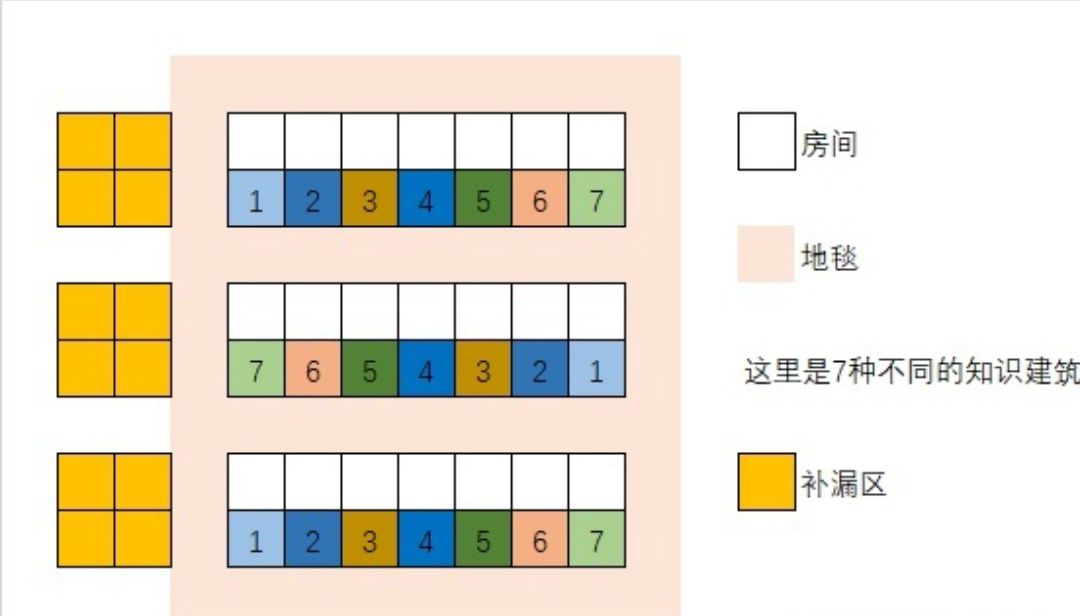 尽量保证每一个房间,7种知识都可以学到。这一块的布局其实很灵活,我是分两排,一排房间一排建筑。7种知识建筑轮流来摆,就是下图的样子,每种知识尽量使用同一个建筑,建筑等级轮回也是会保留的,利于后期学习知识。中间有柱子的话,多拉开一格就是。我这个摆放方式主要是懒。。方便一大群水手学完然后卖掉,针对一两个人当然有更优的,一个房间周围围着7种建筑的也是没问题。